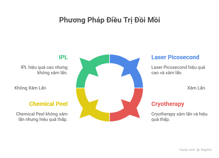 Laser Picosecond (PicoSure Pro; PicoStar): Đây là công nghệ đột phá, được xem là "tiêu chuẩn vàng" trong điều trị sắc tố. Với khả năng phát xung cực ngắn, năng lượng cao, laser Picosecond phá vỡ các hắc sắc tố melanin thành những mảnh siêu nhỏ, dễ dàng đào thải. Điều này mang lại hiệu quả vượt trội cho đồi mồi, đồng thời giảm thiểu tối đa nguy cơ tăng sắc tố sau viêm.
